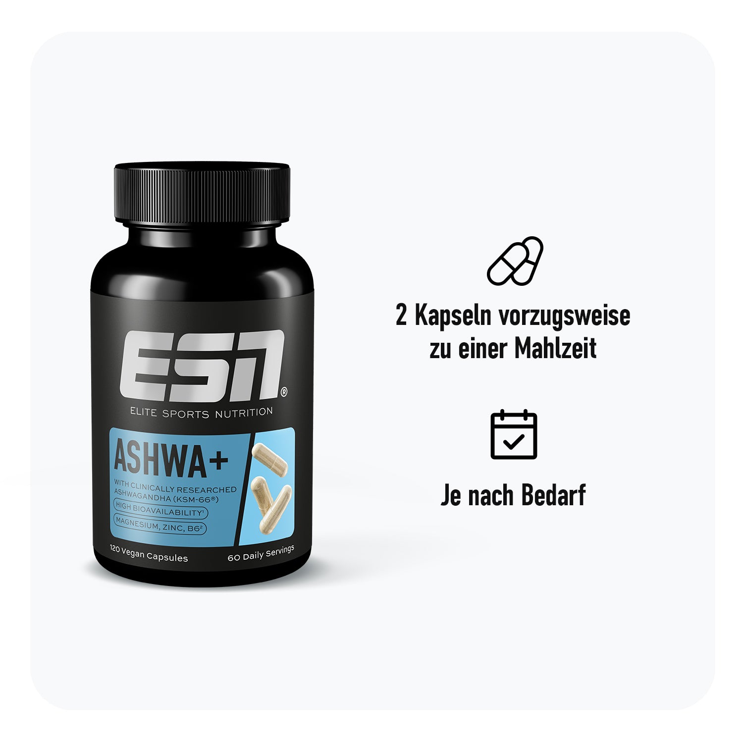Antioxidative stress control – mit unserem Ashwa+. Wir haben patentiertes Ashwagandha (KSM-66®) mit Anti-Stress-Nährstoffen für mentale Balance und Zellschutz kombiniert.1,2,3 Der ideale Support, den du bei harten Workouts oder einem stressigen Alltag brauchst.