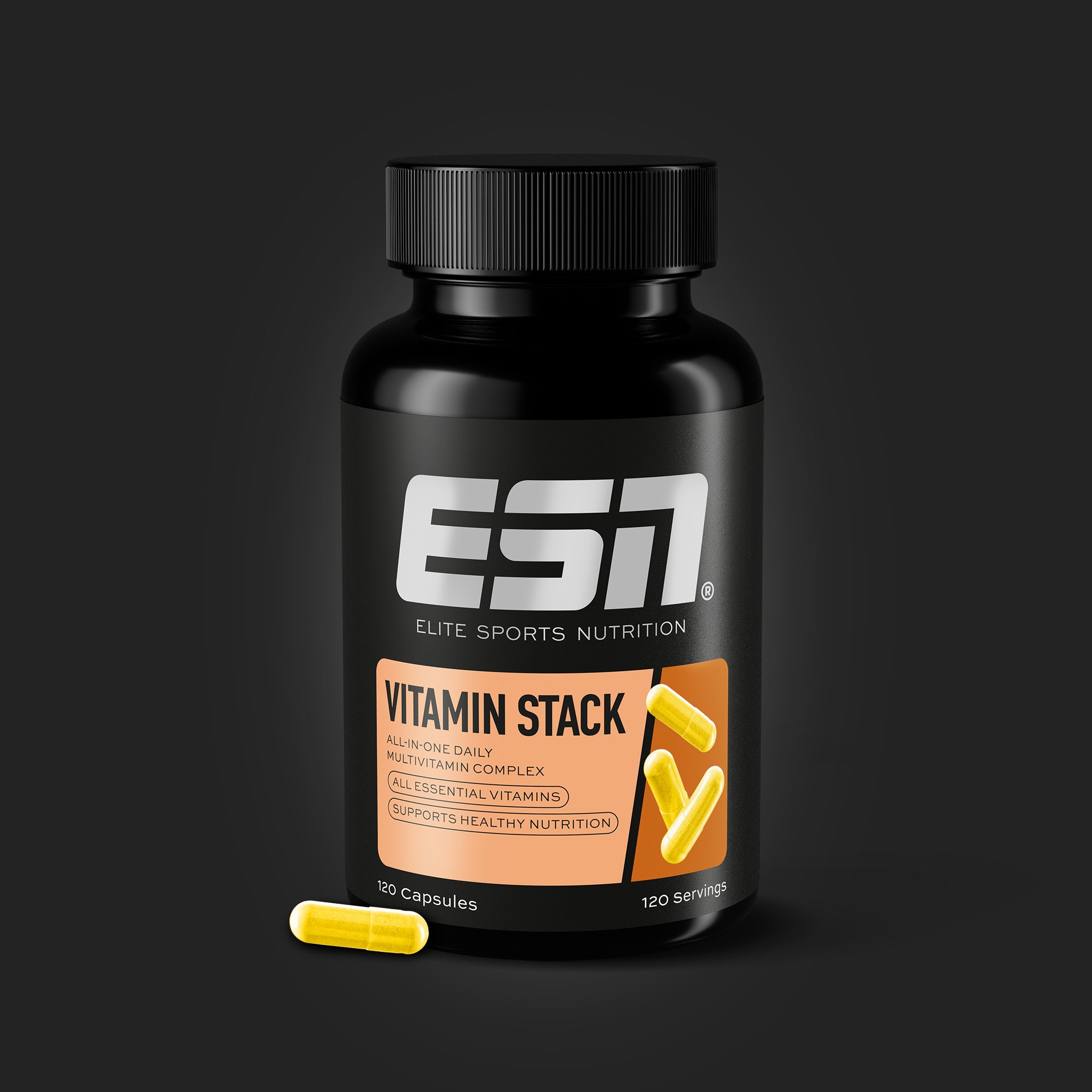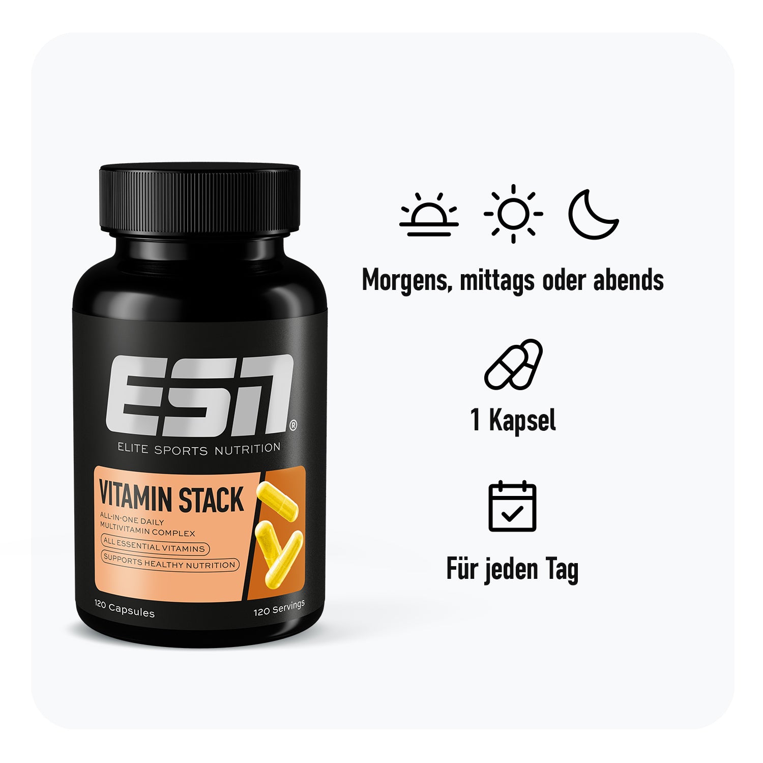 Vitaminmischung [Vitamin C (L-Ascorbinsäure), Trennmittel (mikrokristalline Cellulose) Niacin (Nicotinamid), Vitamin E (DL-alpha-Tocopherylacetat),Pantothensäure (Calcium-D-Pantothenat), Biotin (D-Biotin), Vitamin A (Retinylacetat),Vitamin D (D3/Cholecalciferol), Vitamin B12 (Cyanocobalamin), Vitamin B6 (Pyridoxinhydrochlorid), Riboflavin (Vitamin B2), Thiamin (Thiaminmononitrat), Vitamin K(K1/Phytomenadion), Folsäure (Pteroylmonoglutaminsäure)], Kapselhülle (Überzugsmittel (Hydroxypropylmethylcellulose))Vitamin Stack Key-Facts