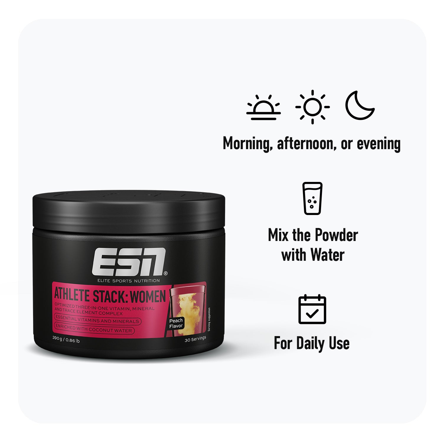 Vitamins and Minerals Mixture 58%(Coconut Water Powder, Magnesium Citrate, Calcium Acetate, Taurine, Potassium Citrate, Glycine, Vitamin C (Ascorbic Acid), Vitamin E (Mixed Tocopherols), Zinc Gluconate, Ferrous Bisglycinate, Folic Acid (Pteroyl Monoglutamic Acid), Niacin (Nicotinamide), Pantothenic Acid (Calcium-D-Panthothenate), Sodium Selenite, Manganese Bisglycinate, Vitamin D (D3/Cholecalciferol), Vitamin B6 (Pyridoxine Hydrochloride), Biotin (D-Biotin), Chromium Picolinate, Thiamine (Thiamine Mononitrate), Riboflavin (Vitamin B2), Vitamin K (K2/Menaquinone-7), Vitamin A (Retinyl Acetate), Copper Bisglycinate, Vitamin A (Beta Carotene), Potassium Iodide, Vitamin B12 (Methylcobalamin, Adenosylcobalamin, Hydroxocobalamin)), Flavoring, Acid (Citric Acid), Glycine, Color (Carotenes), Anti-Caking Agent(Silicon Dioxide), Sweeteners (Sucralose, Acesulfame K), Coloring Food (Barley Malt Extract (Gluten Free)).Key Facts – Athlete Stack Women Powder