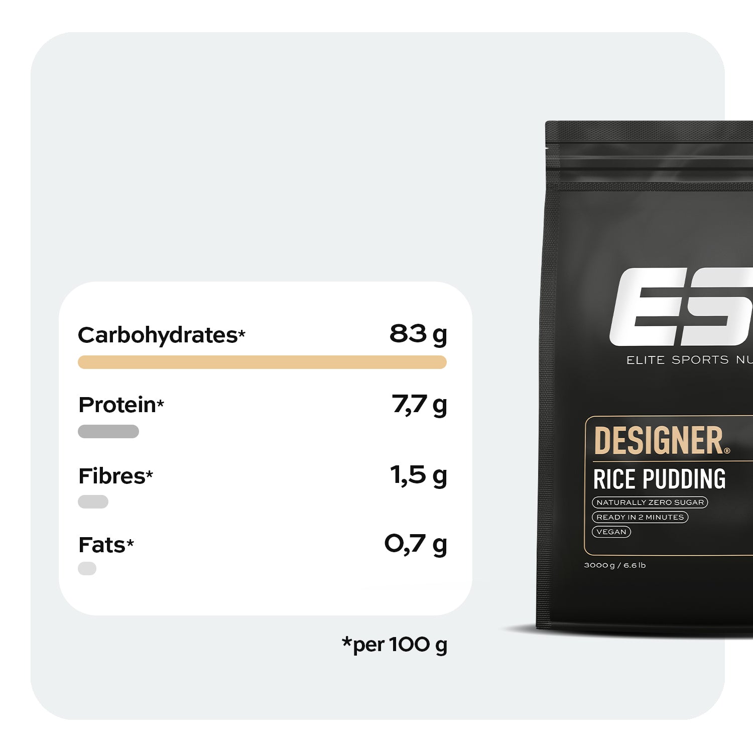 Carb up with rice - with our Designer Rice Pudding. Whether as a snack, pre- or post-workout meal or the basis for your winning breakfast - our rice pudding is the perfect, quickly digestible and complex source of carbohydrates to provide your body with optimum energy for your training and everyday life.