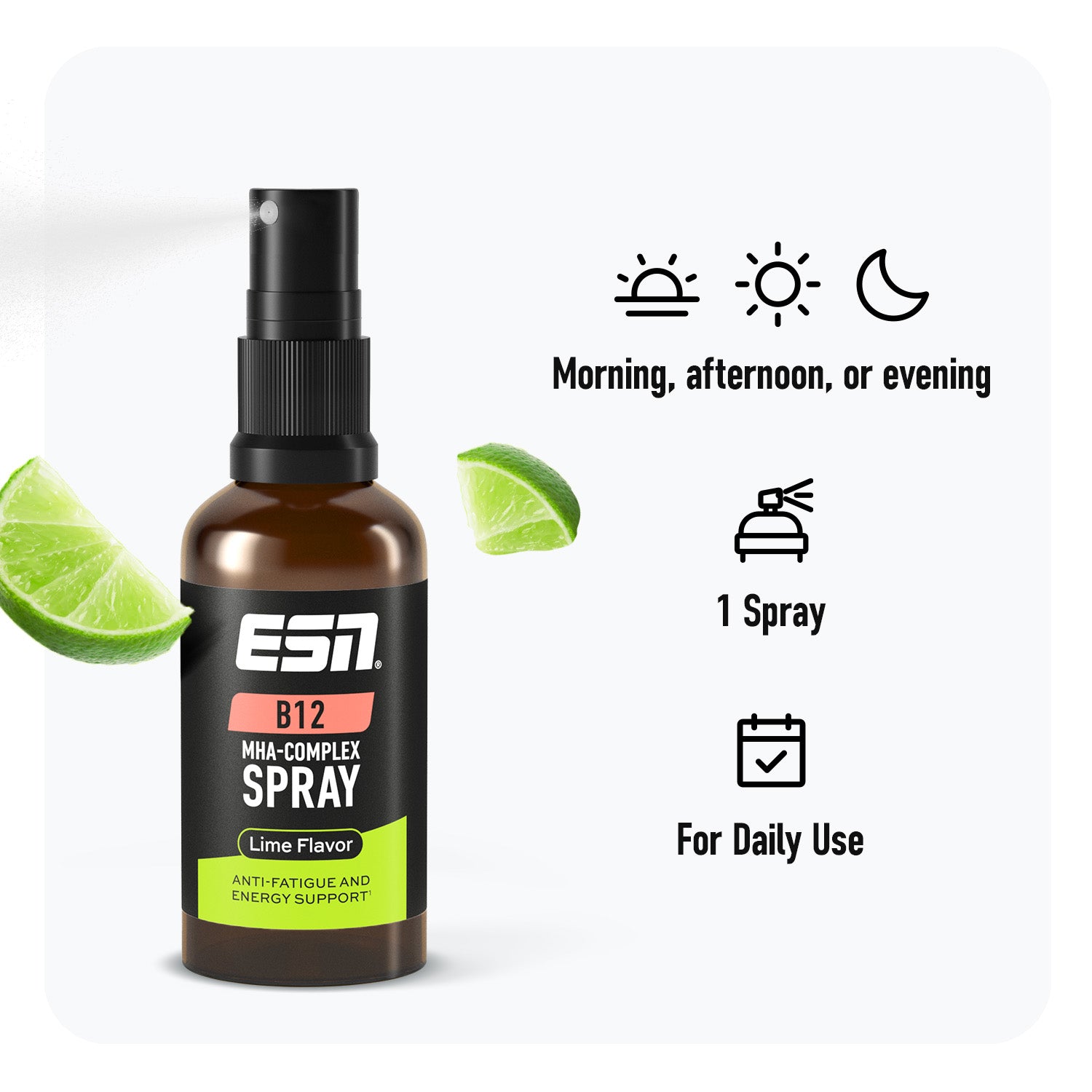 With 500 μg of vitamin B12 per spray, the spray is optimally dosed to contribute to normal energy metabolism, 1 to the reduction of tiredness and fatigue 2 and to the normal function of your immune system 3. Thanks to the high-quality MHA complex, the bioavailability is outstanding and in combination with the delicious lime flavor, our spray ensures enjoyable supplementation.